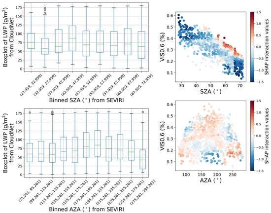 Figure 9 shows that CloudNet LWP changes depending on satellite viewing geometry in the left panel and the SHAP interaction values in the right panel. SHAP values are useful for interpreting situations in which each input feature has a different contribution to the prediction, but works with each other to obtain the prediction. Each input feature either increases or decreases the prediction. SHAP interaction values allow visualizing a combined contribution as a feature’s changes with another feature changing. Higher (lower) SHAP interaction values represent higher (lower) LWP predictions with different contributions from two input features. In the PD plots, it was found that SZA has a stronger effect on retrieved LWP particularly at high values for Leipzig and Lindenberg, while AZA shows a less pronounced partial dependence for all stations. The left panel in Figure 9 shows that LWP varies with both SZA and AZA, although this variation only seems to be systematic in the case of AZA. This suggests that the diurnal cycle of LWP cannot explain the relatively strong influence of SZA on LWP predicted by the model. In this case, the angle information can still play a supplementary role in retrieving LWP by interacting with VIS0.6. In the SHAP interaction plot, the interaction of VIS0.6 and SZA has negative contributions on the prediction in general, which means that the combined contribution reduces the predicted LWP values. Meanwhile, for the range of high SZA, high reflectance in VIS0.6 increases the predicted LWP, while low reflectance of VIS0.6 decreases the predicted LWP. It has been reported that retrieved LWP is strongly dependent on solar geometry [,]. This has been largely attributed to the COT retrievals, which directly affect LWP retrievals. COT tends to increase with increasing SZA and to be overestimated at SZA > 60. Note that, although SZA has the strongest interaction with VIS0.6, the interaction might be affected by other features, as SZA and LWP are correlated with other NIR channels to some extent.
