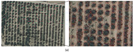 In other studies, such as Tagle et al. [] and Rizeei et al. [], object-based image analysis (OBIA) was used to conduct the detection; Wang et al. [] and AlShidi et al. [] used hand-crafted operations in combination with machine learning techniques; and Dos Santos et al. [] and Santoso et al. [] applied morphology analyses. Al-Ruzouq et al. [] conducted date palm mapping using OBIA over RGB aerial imagery. The selected technique intends to classify land cover classes instead of individual objects; thus, the detection results referred to areas containing date palms instead of an individual counting of date palm trees. Also, Tagle et al. [] used the same technique, but they implemented a step to split the crown masks and obtain individual crowns. That allowed the single palm tree counting per species by using the canopy height model. However, the individual segmentation of palm crowns failed when the palms were too close and they had similar heights. Additionally, Dos Santos et al. [] used a mathematical morphology technique to locate babassu palms in open agricultural environments. By utilizing a shadow extraction process and a shadow object analysis process, they were able to detect juvenile and adult palm trees in farmlands, with low-to-medium palm tree density. When detailing the reported methods and generated results, it is clear to us that RetinaNet provided a much fast and straightforward technique to individually map palms, despite their changeable appearance across multiple scenes over a large scale. Following that order, the available architectures in deep learning could already accelerate tree inventories when datasets and computational power are presented.