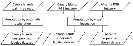 For the creation of the labeled dataset, both the imagery from the Canary Islands and Alicante and the Phoenix palm map of the Canary Islands were used, as depicted in Figure 3. Unsupervised labeled data refers to automatically generated annotations, whereas supervised labeled data refers to manual annotations that are created by visual inspection. The idea of using unsupervised and supervised labeled datasets was inspired by the work of Weinstein et al. []. They used a semi-supervised approach to first create noisy data for the initial training using unsupervised methods and re-trained the resulting tree-crown detection model with high quality labeled data. From the point-annotated Phoenix palm map of the Canary Islands, unsupervised and supervised labeled datasets were obtained (available in the Supplementary Material). With these annotations, low-quality, and high-quality, respectively, the deep learning model had the chance to learn the initial palm tree features. The experiments explained below allowed for us to assess the advantages and disadvantages of using and combining these two classes of datasets in transfer learning. Appendix B presents details on the datasets creation and characteristics.