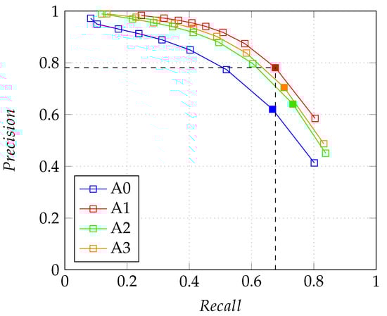 The precision-recall curves for the resulting models are plotted in Figure 5. As noted, A1 has the best performance by placing its curve with the highest values. At a threshold of 0.2, all approaches reach the best balance point, which we defined as the minimum difference between the recall and precision reached by each. The curves of the different approaches let us observe that, for equal scores of recall, A1 provides higher scores of precision. In other words, at a probability score threshold of 0.2, when the model predicts a palm, it is correct 78.10% of the time, whereas it correctly identifies 67.66% of all palms. Thus, we can state that adapting the pre-trained network with the supervised labeled data of the Canary Islands supports a conservative higher detection rate of Phoenix palms in the Alicante dataset.