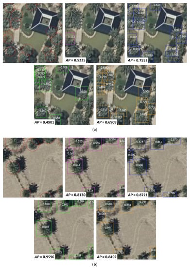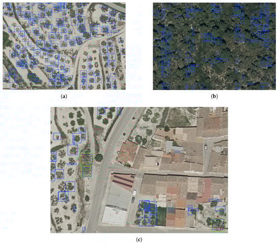 Figure 8 presents parts of the images from the independent testing dataset. From the first three single-scene images, Figure 8a–c, Phoenix palms are the main predominant vegetation. On the contrary, in the three multiple-scene images, palms do not rule the landscape. Given that the model has to detect palms across these different palm scenes and no-palm scenes, for the further improvement of the detection results, a more diverse dataset for training should be collected. It should contain negative examples and other positive examples—natural and semi-natural scenes of Phoenix palm populations. Usually, in these scenes, palms are individually distant—scattered—or in groups—clumps and clusters. In our case, the training dataset is restrained to images of urban and rural scenes that are dominated by planted Phoenix palms. Nevertheless, in the independent testing dataset, some natural and semi-natural scenes were included in order to observe the generalization capacity of the detection model. The detection results demonstrated that the model is able to classify and locate Phoenix palms in these unseen scenes.