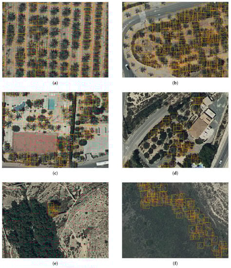 Some examples of the Phoenix palm predictions generated by the resulting model of A1P+N on the imagery of the testing dataset. (a) Plantation; (b) Orchard; (c) Garden; (d) Multiple 1 “Barranco de Sant Antoni” (38°18′3″N, 0°40′18.10″W, 130–137 m above sea level), it is described to be the habitat of scattered individuals of “palmeras de rambla” (Phoenix iberica) and date palms []; (e) Multiple 2 “Vinalopó river” above Elche (38°18’6”N, 0°43’14″W, 90–215 m above sea level), it also contains “palmerales de rambla” and date palms but as scattered individuals and in clumps; and, (f) Multiple 3 “Camino de la Senyeta” (38°16′N, 0°31′54″W, 4–5 m above sea level), with again “palmerales de rambla” and date palms grouped in a palm grove originated from an abandoned palm nursery []. The detections are presented as orange boxes. Images derived from Ortofoto RGB 2018 CC BY 4.0 © Institut Cartogràfic Valencià, Generalitat; OrtoPNOA 2018 CC BY 4.0 www.scne.es.
