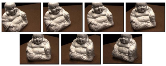 23], the dataset was generated under seven different lighting conditions from 49 or 64 positions in the laboratory. Calibrated camera parameters and ground truth points generated by structured light scanning were provided. The scene we choose contains 64 images of 1600 × 1200 pixels. To evaluate the effectiveness of our specular component, we choose 7 images with some specular areas shown in