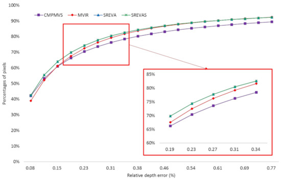 Figure 8 further shows the accumulated distribution of depth errors of the surface reconstructed by CMPMVS and refined by MVIR, SREVA and SREVAS. It can be observed that all methods can improve the number of accurate pixels while SREVA and SREVAS are better than MVIR, especially when the relative depth error is less than 0.4%.