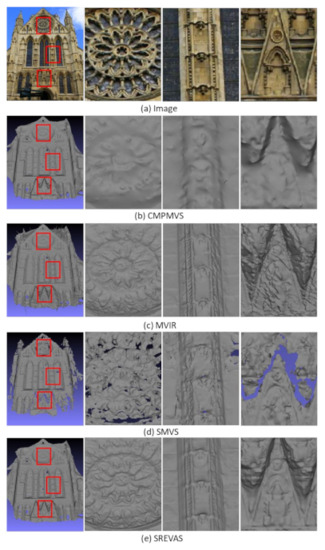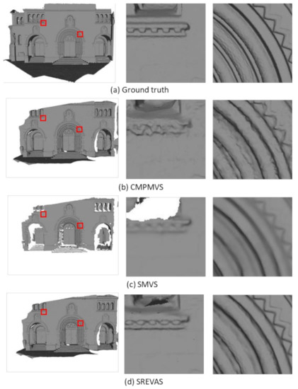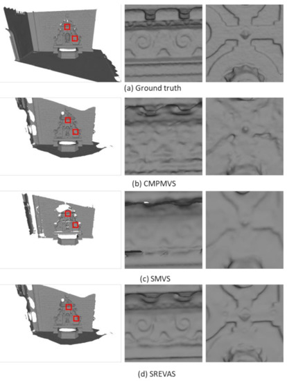 Figure 10 shows the reconstructed surfaces, including ground truth (from laser scanning), the initial surface from CMPMVS, the refined surface by SREVAS and the surface reconstructed by SMVS, respectively. The overall shapes are well reconstructed by all three methods. However, there are apparent void areas in the surface reconstructed by SMVS. It also results in an over-smoothed surface without many details, whereas the surface from CMPMVS is noisy. In contrast, results from SREVAS are sharper and more similar to the ground truth than CMPMVS and SMVS.
