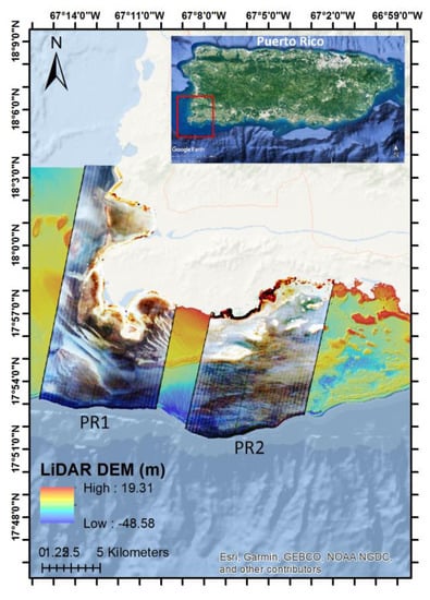 - NOAA, National Oceanic and Atmospheric Administration (NOAA). Digital Coast Data Access Viewer. Custom processing of 2006 NOAA Bathymetric Lidar: Puerto Rico; NOAA Office for Coastal Management: Charleston, SC, USA, 2006. Available online: https://coast.noaa.gov/dataviewer (accessed on 7 April 2020).
