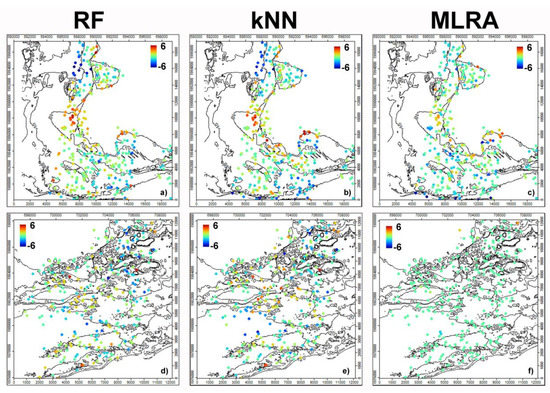 Training data points for both sub-areas PR1: (a–c) and PR2: (d–f) with residual depth values resulting from RF (a,d), kNN (b,e), and MLRA (c,f).