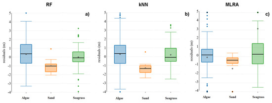 Box-plots of seafloor-type classes and bathymetry residuals from each resulting satellite-derived bathymetry (SDB) using (a) RF, (b) kNN, and (c) MLRA. Seafloor types available only for PR2 [27].