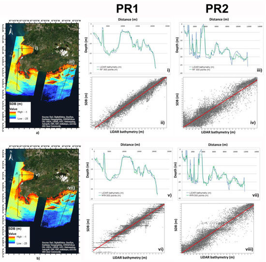 Satellite-derived bathymetry from stage 2 using (a) the RF algorithm and (b) the kNN algorithm. PR1: Bathymetric profile comparison and scatterplot between airborne laser bathymetry and stage 2 SDB using RF (i,ii) and kNN (v,vi). PR2: Bathymetric profile comparison and scatterplot between airborne laser bathymetry and stage 2 SDB using RF (iii,iv) and kNN (vii,viii).
