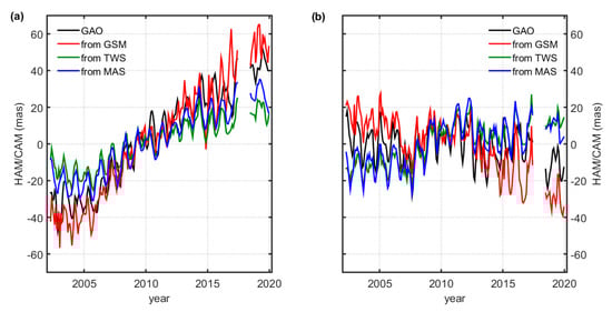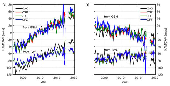 Another correction included in Level-3 data and not included in Level-2 is a GIA correction that should be applied to remove effects from postglacial rebound, but also from present ice mass changes. It is known that postglacial rebound primarily affects PM trends, but rather does not affect interannual, seasonal, and shorter HAM/CAM variations. In previous sections, we noticed that there are visible differences in trends between GSM-based HAM/CAM and TWS-based HAM/CAM (Section 3.1, Section 3.3), and between GSM-based HAM/CAM and MAS-based HAM/CAM (Section 3.3). Such trend differences mainly result from the use of GIA model in TWS and MAS data (they are both Level-3 data), which is not used in GSM (Level-2). The GIA model applied in all TWS solutions and in MAS data used in this study is the same [], which allows for consistency between the series.