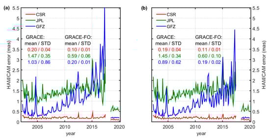 At present, a number of temporal gravity models based on GRACE/GRACE-FO observations are available to users (available e.g., at http://icgem.gfz-potsdam.de/series). These estimates, made accessible by various institutes, have different processing strategies, parameters, and background models applied. Therefore, the results arising from their use are similar but not identical. The differences between particular GRACE/GRACE-FO models make the interpretation of the results more difficult. The question of which solution is the most appropriate remains unanswered because the response depends on, among other factors, the purpose of the intended research. Previous papers that have exploited temporal gravity models to analyze global mass changes or PM variations due to mass redistribution used either the data from one processing center (e.g., [,,]) or the mean of several solutions (e.g., [,]). There are also papers in which a number of GRACE models were evaluated based on external data (e.g., [,,,,]), but no detailed compatibility analysis between individual GRACE solutions was performed. In particular, no such analysis has been conducted for the newest generation of the GRACE models (RL06) or for the first GRACE-FO datasets. Therefore, we begin our analyses with a study of the internal consistency between HAM/CAM from GRACE/GRACE-FO solutions.