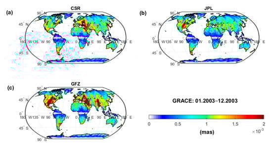 Water mass changes in some areas may affect HAM/CAM more than the corresponding mass variations in other regions. This is due to the geographical location of the area, but also because of the size of annual variation in water mass in this region, resulting from seasonal amplitudes of precipitation, runoff and evaporation. For example, tropical areas in Africa, Southeast Asia, and the Amazon, which have strong annual amplitudes of TWS, have a greater impact on HAM/CAM variability than desert areas [,]. Therefore, we also examine the spatial agreement between HAM/CAM from particular GRACE/GREACE-FO solutions and HAM/CAM from the mean GRACE/GRACE-FO data. This can be conducted with the use of GRACE/GRACE-FO Level-3 data. The maps presented in Figure 3, Figure 4 and Figure 5 show the RMS of differences (or RMS error; RMSE) between HAM/CAM from individual GRACE/GRACE-FO models and HAM/CAM from the mean GRACE/GRACE-FO data. We consider three different periods: 2003, which represents the initial period of the GRACE mission (Figure 3), 2006, which represents the period of best GRACE performance (Figure 4); and 2019, which represents the initial period of the GRACE-FO mission (Figure 5). This analysis indicates that the largest deviations from the mean appear for the initial period of GRACE, which may be due to the fact that not all instruments have been properly calibrated during this period and the maximum accuracy of measurements has not yet been achieved [,]. For the first months of GRACE-FO these variations are visibly smaller, which indicates improvements in GRACE-FO equipment compared to its predecessor. Nevertheless, for GRACE-FO, the RMSE values are not as low as for period of highest GRACE accuracy, because GRACE-FO was not fully operational at the end of 2019. The HAM/CAM from JPL is distinguished by the highest spatial consistency with HAM/CAM from the mean GRACE/GRACE-FO, whereas HAM/CAM from GFZ is characterized by the highest deviations from the average. The largest differences from the mean are observed for the Northern Hemisphere, especially Europe, the Middle East, and the United States. In the Southern Hemisphere, the southern parts of Argentina and Chile are most affected by deviations from the mean.