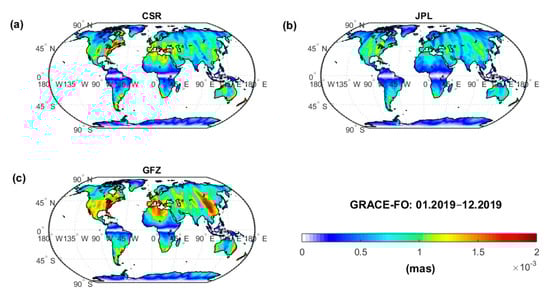 Maps of RMS of differences between the mean GRACE-FO solution (mean of data from CSR, JPL, and GFZ) and (a) HAM/CAM from CSR, (b) HAM/CAM from JPL, and (c) HAM/CAM from GFZ for 2019 (initial period of the GRACE-FO mission). The values are given in mas.