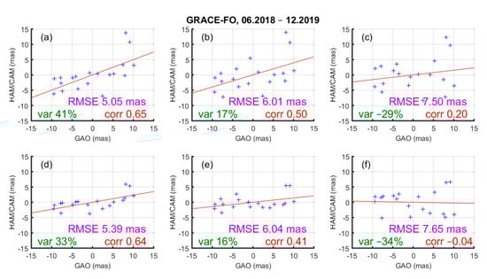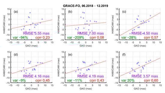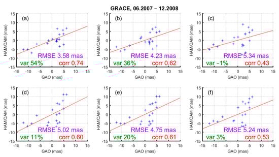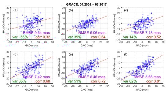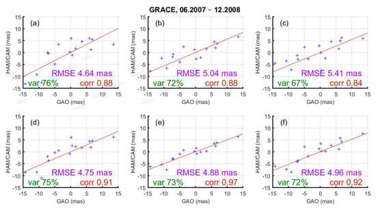 In order to evaluate GRACE and GRACE-FO-based HAM/CAM, for each time interval and for each equatorial component of HAM/CAM separately, we produced scatter plots showing the relationship between HAM/CAM and GAO (Figure 6, Figure 7, Figure 8, Figure 9, Figure 10, Figure 11, Figure 12 and Figure 13). The red lines in the plots were fitted to the data points using the least squares method; the closer the points to the red line, the higher the relationship between the series. To assess the quality of GRACE/GRACE-FO-based HAM/CAM in each time interval, we introduce the following parameters: correlation coefficients, RMSE, and relative explained variance. The latter indicator shows the variability agreement between the reference series (here GAO) and the evaluated series (here HAM/CAM):