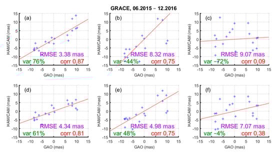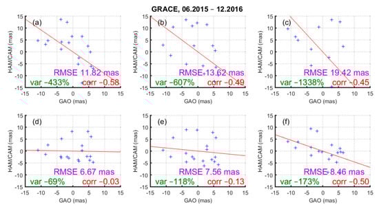 Scatter plots showing the relationship between χ1 component of GAO and HAM/CAM from (a) JPL GSM, (b) JPL TWS, and (c) JPL MAS, and scatter plots showing the relationship between χ2 component of GAO and HAM/CAM from (d) JPL GSM, (e) JPL TWS, and (f) JPL MAS. The red line was fitted to the data points using the least squares method. The values in purple indicate the RMSE, the values in red (corr) indicate the correlation coefficients between series, and the values in green (var) indicate the relative explained variances. The considered time period is April 2002 to June 2017. Note that the critical value of correlation coefficient for 63 independent points and a 95% confidence level is 0.21, while the standard error of the difference between two correlation coefficients is 0.18. All the parameters were computed after removal of trends.