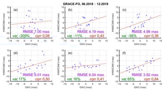 Scatter plots showing the relationship between χ1 component of GAO and HAM/CAM from (a) JPL GSM, (b) JPL TWS, and (c) JPL MAS, and scatter plots showing the relationship between χ2 component of GAO and HAM/CAM from (d) JPL GSM, (e) JPL TWS, and (f) JPL MAS. The red line was fitted to the data points using the least squares method. The values in purple indicate the RMSE, the values in red (corr) indicate the correlation coefficients between series, and the values in green (var) indicate the relative explained variances. The considered time period is June 2018 to December 2019. Note that the critical value of correlation coefficient for 12 independent points and a 95% confidence level is 0.50, while the standard error of the difference between two correlation coefficients is 0.47. All the parameters were computed after removal of trends.