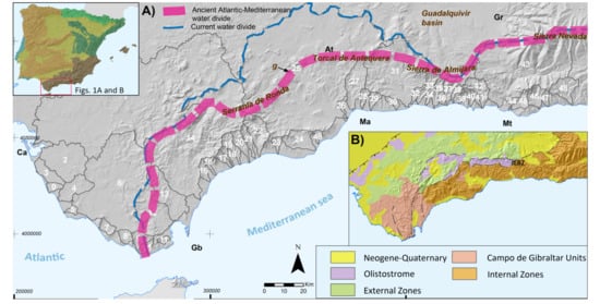 The Cenozoic convergence between Africa and Iberia led to the formation of an arcuate orogen, the Gibraltar Arc, e.g., [,], defined by the orogenic nappe stacking of pre-Cenozoic materials and the emplacement of Eocene to Miocene syn-orogenic flysch and olistostromic units (Figure 1B and Figure 2). In the central sector of the range, roughly oriented NE–SW arcuate and elongated ridges are mainly made up of Mesozoic Subbetic materials overthrusted by the syn-orogenic units [,] (Figure 1B). These ridges constituted the ancient Late Neogene water divide between the Atlantic and Mediterranean basins (Figure 1A and Figure 2), as indicated by several paleogeographic reconstructions [,,]. Along this ancient water divide were the last known gateways connecting the Atlantic and the Mediterranean (Guadalhorce strait) before the eventual emergence of the Betic orogen in the zone triggering the MSC event, e.g., [,,]. As can be noticed from Figure 1A, the present water divide retreated to the west, promoting important fluvial captures from the Mediterranean slope [] and probably the eventual reconnection of the Atlantic and Mediterranean basins [].