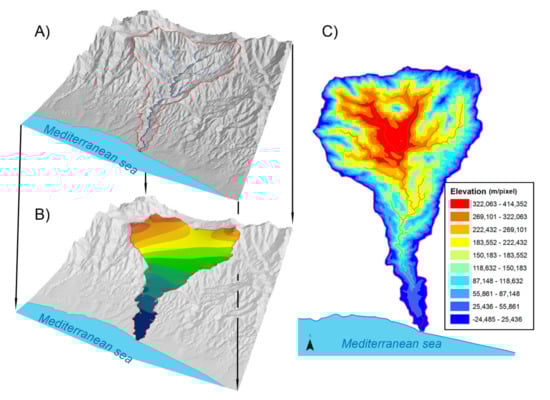 To estimate the amount of post-MSC erosion in the studied zone, we used individual drainage basins as reference spatial units for map algebra (Figure 1). Drainage basins are classically considered in erosion studies focused on relief development as representative functional units linked to erosion processes [,,,].