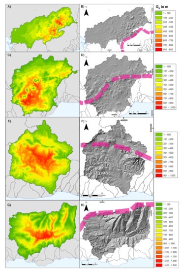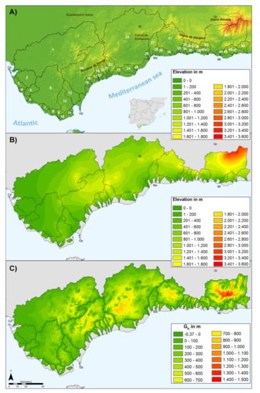 The raster-based analysis undertaken in this study allows us to obtain (Figure 3C) not only the overall GR value for each drainage basin, but also a continuous distribution of this parameter (denudated rock mass) in meters for spatial units of pixel size. In the first case, the value comes from the computation of the total volume between the ridgeline surface and the present topography, and in the second from the subtraction of the ridgeline surface minus the present topographic DEM pixel by pixel—a continuous GR model for the whole Gibraltar Arc.
