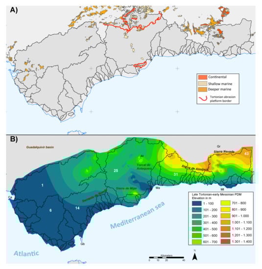 Late Tortonian-early Messinian Paleogeoid Present Distribution Model (PDM): (A) Tortonian sedimentary sequences and geomorphic markers used as elevation proxies (see [,]) and (B) the resulting proxy-based model of the Tortonian Paleogeoid PDM for the whole WCBC. At: Antequera, Ca: Cádiz, Gb: Gibraltar, Gr: Granada, Ma: Málaga, Mt: Motril.