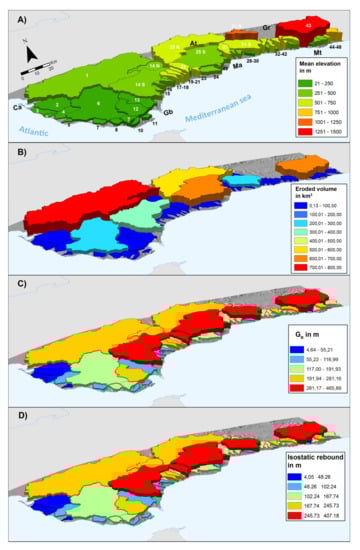 This paper presents the results of an analysis of the erosion volumes and rates on 50 individual drainage basins around the Gibraltar Arc to calculate the isostatic response from erosional unloading according to the Airy isostasy (Figure 1A). The bulk amount of denudation was calculated in a GIS environment using map algebra based on the analysis of Digital Elevation Models (DEMs). The used methodologies improve previous methods to reconstruct proxy-based pre-incision surfaces in drainage basins [,] and are applied to the large-scale analysis of mountain ranges. The study is based on the calculation of the geophysical relief (GR) of [] and the application of Airy-derived isostatic functions to evaluate the theoretical isostatic response (uplift) to erosional unloading by taking into account crustal parameters commonly considered for this zone of the Betic Cordillera []. The comparison between the calculated pre-incision topography before the MSC and the present erosional landscape allowed us to evaluate the eroded rock volume for each analyzed basin along the Gibraltar Arc. The obtained data not only allowed us to estimate the differential distribution of uplift within the Betic Cordillera, but also the bulk isostatic response of the whole orogen.