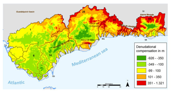 In the studied area, the resulting comparison model shows a widespread dominance of compensated and overcompensated zones in the W and SW sectors (Figure 8). On the contrary, undercompensated areas dominate in the N and NE sector around Sierra Nevada, the most uplifted zone of the whole Betic Cordillera. In the central part of the studied area (basins 14 and 25), some protruding paleoreliefs along the ancient Messinian water divide (Serranía de Ronda, Torcal de Antequera, Lijar and Grazalema ranges) are still compensating, displaying red and orange colors (Figure 8). These undercompensated paleoreliefs are older than the onset of the MSC, and were working as emergent islands shortly before the Atlantic–Mediterranean disconnection []. Southwards, the Sierra de Mijas shows important values of post late Tortonian uplift, indicating, in this case, under-compensation, mainly due to local tectonic uplift []. In general, the larger basins display compensation in their central areas, but this progressively decreases towards the ridgeline areas, as is the case of the Guadalhorce (25), Vélez (31) and Guadafeo (43) basins. However, a similar pattern occurs in the small basins in the western zone, which are totally undercompensated (Figure 8), indicating that the process is regional and independent of the scale. In contrast, the entire eastern sector is clearly overcompensated and only the ridgeline between the Guadiaro basin (14) and the Guadalete (1) basins is still compensating, showing that the ridgeline areas are the last zones to reach the isostatic compensation.