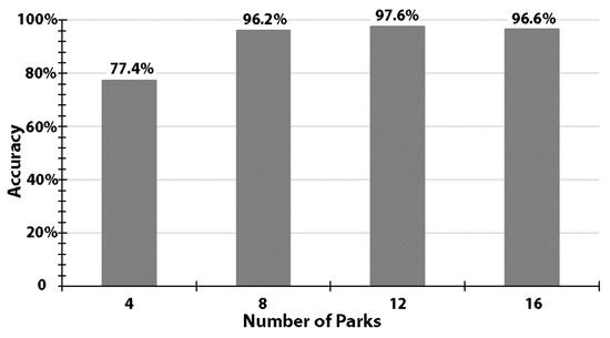 Accuracy levels using training samples of 4, 8, 12, or 16 randomly-selected parks, while constantly using 4 other parks for validation.