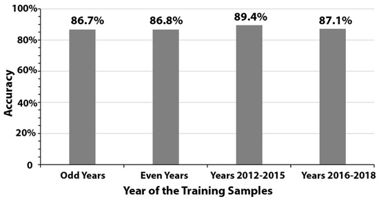 Accuracy levels using training samples from odd years, even years, years 2012–2015, and years 2016–2018.
