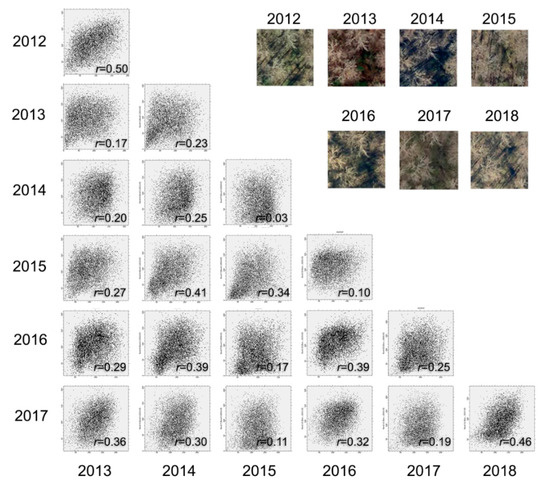 The temporal variation in forest structure was caused by two major factors. First, plant invasion is not static. Autumn olive, like many other exotic plants, changes the forest environment by gradually replacing native species [43]. As a result, forest structure in the plots was steadily modified over the seven-year study period. Second, aerial images were taken in different years. Like the example illustrated in Figure 1, a slight change in viewing or solar elevation angle over the years led to a high contextual variation for the same plot area. Figure 5 depicts scatterplots illustrating the spectral relationship of the red band between Figure 1 sample images collected annually from 2012 to 2018. Here, we compared the red bands for the purpose of demonstration, although the green and the blue bands revealed similar relationships. We calculated Pearson’s correlation coefficient (r) for all of the scatterplots, resulting in a maximum correlation of only 0.5. We further calculated the average variance for the sample images, which ranged from 23.6% to 35.1%, with a standard deviation of 15.6% as compared to the mean.