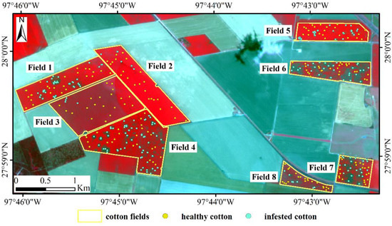 Cotton root rot, also known as Texas root rot, is caused by the soil-borne fungus Phymatotrichopsis omnivora. This disease occurs commonly in the southwestern and south central United States [1]. The leaves of the infested plant first turn yellow and then wilt rapidly, followed by plant death in a few days. Plant infection typically starts around the flowering stage and will continue for the rest of the season. Thus, the disease significantly reduces cotton yield and lowers lint quality [2]. Besides, the infested areas are stable across years, but the spatial distribution is not continuous across the field and the shapes of infested areas are irregular [3]. In early 2015, the Topguard Terra fungicide was registered to control the disease [4]. However, this fungicide is very expensive, so it is more cost-effective for farmers to apply the fungicide only to infested areas. Therefore, it is of great significance to map cotton root rot-infested areas for the management of this disease.