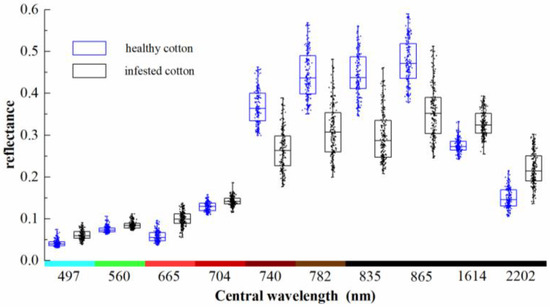 These points were overlaid on the preprocessed Sentinel-2A imagery and the reflectance values were extracted. The spatial distribution of these points is shown in Figure 2. The spectral reflectance values of the 384 points are shown with box-scatterplots in Figure 4. As can be seen from the figure, the reflectance of infested cotton in the bands of 497–704 nm was higher than that of healthy cotton. The average reflectance in the bands of 740–865 nm of healthy cotton was remarkably higher than that of infested cotton with a difference of about 0.09–0.15. In the bands of 1614 and 2202 nm, which are sensitive to the response of crop moisture, the reflectance of infested cotton was higher than that of healthy cotton.