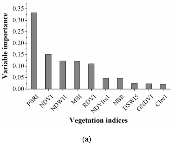 The RF algorithm was used to select the sensitive spectral indices and texture features for identifying cotton root rot. The results are shown in Figure 5. From Figure 5a, PSRI had the most significant impact on cotton root rot classification, followed by NDVI, NDWI1, MSI, and RDVI. Among them, PSRI, which indicates the state of canopy senescence, was the most important spectral index for cotton root rot identification. NDWI1 and MSI provide a measure of the amount of water contained in the canopy foliage. NDVI and RDVI are related to the general quantity and vigor of green vegetation. The first five spectral indices were selected to build the BLR model.
