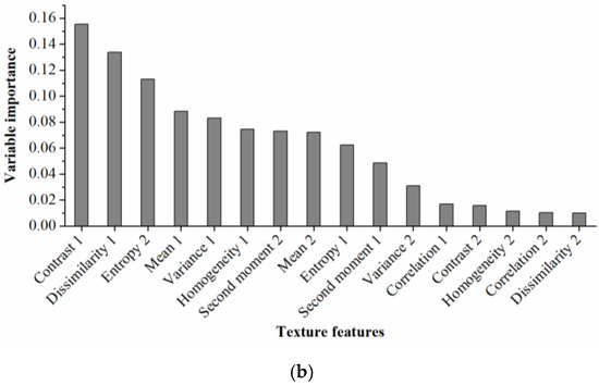 From Figure 5b, it was obvious that Contrast 1 was the most important texture feature for cotton root rot classification, followed by Dissimilarity 1, Entory 2, Mean 1, Variance 1, Homogeneity 1, and Second moment 2. The remaining features had little impact on cotton root rot identification, therefore, the first seven important texture features were selected to build the BLR model.