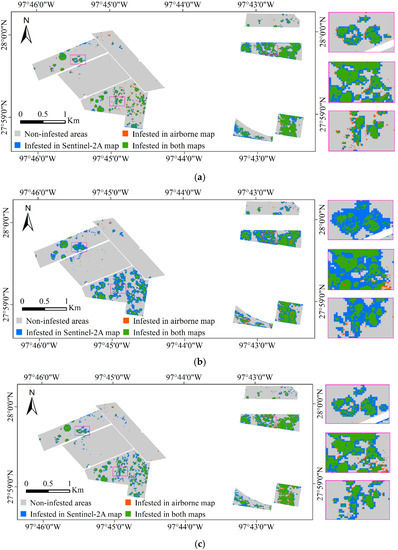 Overlaid cotton root rot classification maps from airborne and Sentinel-2A images for Fields 1–8 and the zoomed in rectangle scenes for the areas marked on the maps are shown at the right. (a) Sentinel-2A classification map based on the spectral model; (b) Sentinel-2A classification map based on the texture model; (c) Sentinel-2A classification map based on the spectral-texture model.