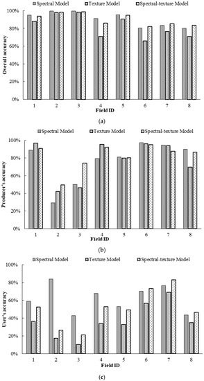 Figure 7 illustrates the differences in the OA, PA, and UA for the infested category for Fields 1–8 based on the spectral model, texture model and spectral-texture model. From Figure 7a, the spectral model achieved the best OA in the discrimination between healthy and infested cotton for Fields 1–5, which had relatively low infestation, followed by the spectral-texture model and the texture model. The spectral-texture model achieved the best OA for Fields 6–8, which had relatively high infestation, followed by the spectral model and the texture model. The overall accuracies of the texture model and spectral-texture model for Fields 1–7 were higher than 80%. From Figure 7b, the PA for the infested category based on the three models was higher than 80% for Fields 1 and 4–7. In addition, combining the spectral and texture features could enhance the performance of detecting more root rot areas, thus resulting in higher PA in cotton fields with low and medium levels of infestation. The UA for the infested category based on the three models was almost below 80% for all fields (Figure 7c), indicating that higher than 20% of the infested areas on the classification map were actually healthy areas for all fields. Moreover, the commission error of the texture model was the highest for all fields. The UA for the infested category of Fields 6 and 7 with severe infestation was higher than that for the other fields. This result indicates that it is feasible to identify cotton root rot in fields with moderate and severe infestation using different features, especially spectral features, and combinations of spectral and texture features. However, it has certain limitations in identifying cotton root rot with Sentinel-2A images for fields with less than 1% infestation.