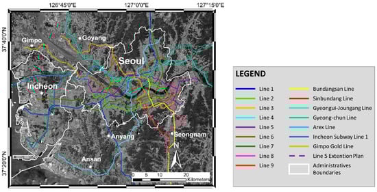 Together with the increase in population, the economy has grown quickly, followed by industrial development. To meet the needs of the city inhabitants, Seoul undertook massive developments, including infrastructure, buildings, and transportation networks. At the end of 2019, a total of 23 rapid transit, light metro, commuter rail, and airport rail lines had been integrated into the Seoul Metropolitan Subway system [55]. This system operates in the Seoul Metropolitan Area, including Incheon and some satellite cities in Gyeonggi Province. Several regional lines such as those in Chungnam and Gangwon provinces are also connected to this system. Figure 1 has shown a map of the subway line that has been operating and in the process of construction in the Seoul Metropolitan Area. New transportation routes have since been added, such as the Gimpo Gold-Line in 2019, and the Line 7 and Line 5 extensions to Hanam City is currently under construction and slated to open in 2020. To improve connectivity in this metropolitan area, several future subway lines (until 2028) are still being planned.