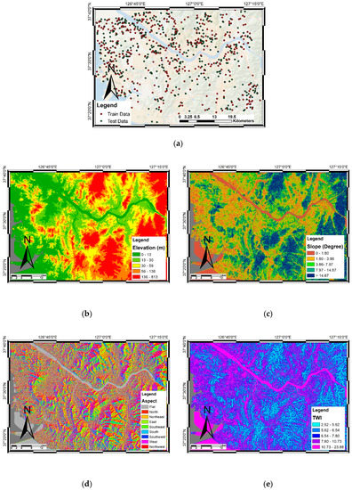 Train-test data point and spatial maps of 10 land-subsidence-related factor: train-test data point (a), elevation (b), slope (c), aspect (d), topographic wetness index (TWI) (e), profile curvature (f), land use (g), groundwater extraction (h), distance to river (i), lithology (j), and distance to fault (k).