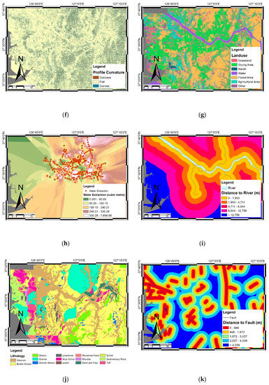 In order to evaluate the relationship between groundwater conditions and the occurrence of subsidence, several factors related to groundwater conditions can be evaluated such as distance to rivers [43,83]. The distance to rivers is represented by the proximity of the rivers and drainages in the study area [40]. The distance to the river map was calculated based on the map of the river provided by the National Geographic Information Institute (NGII). Then, buffers around the river were created (measured in meters), then the raster map was divided into five classes as shown in Figure 3i.
