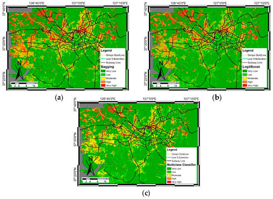 Land-subsidence-susceptibility map generated using three algorithms: the (a) Bagging, (b) LogitBoost, and (c) Multiclass Classifier algorithms.