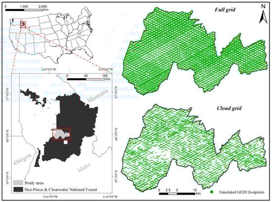 Study area in the Nez-Perce and Clearwater National Forest (Idaho, USA) and distribution of the simulated GEDI footprints.