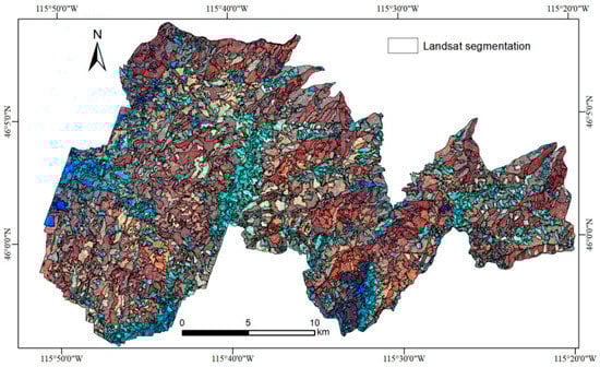 Subsequently, a two-stage object-based evaluation strategy was followed to identify an optimal segmentation []. Area-based dissimilarity metrics of oversegmentation and undersegmentation were used to identify the best combination of input layer weights [,]. Subsequently, measures of spatial autocorrelation [,,,] were used to identify, out of the 135 segmentations generated, the one with the maximum degree of intra-segment homogeneity and inter-segment heterogeneity. The optimal segmentation was obtained, giving the TCB and TCG equal weights in the MRS segmentation algorithm, while TCW was given double weight, and setting compactness = 0.1, shape = 0.1, and scale parameter = 46. For a more detailed explanation of the selection workflow, which combines both unsupervised and supervised object-based evaluation methods, refer to Sanchez-Lopez et al. []. The segmentation resulted in 2098 image-objects. Of these, 39 were smaller than 2 ha, which is commonly used as a threshold between stand and patch forest management units in areas of the Pacific Northwest [], and were therefore merged with the most spectrally similar neighboring image-object, applying the ’remove’ eCognition algorithm. Figure 2 shows the resulting segmentation composed of 2059 image-objects.