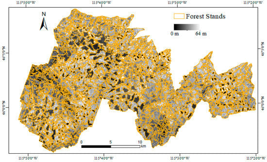 Airborne LiDAR segmentation. The outline of even-aged forest stands (orange vectors) is overlaid on airborne LiDAR data (95th percentile of heights summary metric) displayed in grayscale.