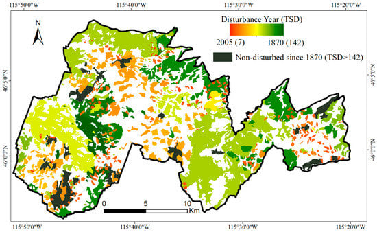 Reference map of stand-replacing disturbances reported in the study area between 1870 and 2005. The dataset was compiled from records of historical burns digitized from aerial photographs [] and digitized perimeters of the clearcut management units reported in the FACTs (Forest Service Activity Track System) harvest dataset []. Twenty forest stands undisturbed since before 1870 were delineated through visual interpretation of 1-m 2011 NAIP (National Agriculture Imagery Program) imagery and added to the dataset.