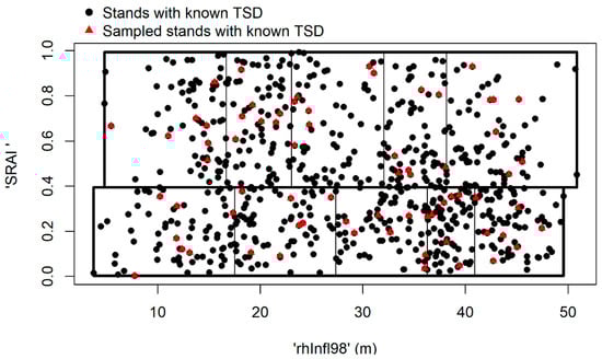 Scheme of the stratified random sampling to extract the training set of stands of known TSD. The mean topographic solar-radiation aspect index (‘SRAI’) and the mean GEDI 98% relative height (from inflection points) (‘rhInfl98′) were used as stratification variables. This is a specific example with sample size = 7 (seven stands per stratum, reported as red triangles), resulting in a total of 70 stands sampled to create the training dataset, for the Landsat segmentation and ‘full grid-within stand’ scenario. In this case, the quintiles of the GEDI 98% relative height are 17.5, 27.4, 36.3, 40.9, and 49.6 m (SRAI < 0.39) and 16.7, 23.0, 32.0, 38.1, and 50.8 m (SRAI > 0.39). The extraction was replicated 100 times per sample size (varying from 1 to 10 in each stratum) for each of the studied scenarios.