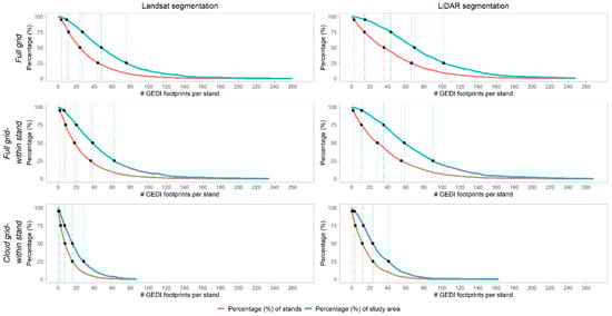 Summary parameters of the cumulative distributions of the number of footprints per stand, expressed as a percentage of the number of stands (i.e., red curves in Figure 6), and percentage of the study area (i.e., blue curves in Figure 6), for the six combinations of segmentation-derived stand maps and subsets of the GEDI simulated footprints.