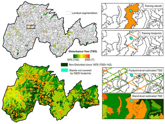 Illustrative example of the methodology for the stand-level TSD estimation, showing the results of one of the 100 instances generated using the Landsat segmentation, the ‘full grid – within stand’ GEDI subset of footprints, and a sample size of 7 training stands per stratum. Top row: location of the randomly selected training stands, with on the right a detail of the GEDI footprints intersecting the training stands (i.e., the footprints used to train the imputation). Bottom row: estimated TSD for the whole study area, with on the right a detail of the footprint—level estimations, which were then aggregated to generate the stand-level estimation. In this specific case, RMSD was 18.9 years, BIAS was 0.4 years, and Perct.10 was 67.0% (71.4% when considering only the stands disturbed since 1910).
