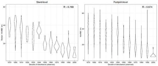 Violin plots (i.e., combination of a box plot and a density plot) displaying the relationship between canopy height (´rhInfl98´GEDI metric) by decade for the illustrative example displayed in Figure 7. At left, values at the stand level, calculated as the median value of the enclosed GEDI footprints; at right, values at the GEDI footprints. R: Pairwise Pearson correlation coefficient between TSD and the canopy height metric.