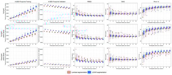 Both the ‘full grid’ and the ‘full grid–within stand’ scenarios have good overall coverage of GEDI footprints per stand. Stands intersecting 20 footprints or more represent 75% of the study area regardless of the segmentation. The ‘cloud grid – within stand’ scenario, on the other hand, is the most restrictive case. Note that the ‘cloud grid’ had approximately 50% fewer footprints than the ‘full grid’ (Section 2.2). Notwithstanding this, stands with more than 7 and 12 GEDI footprints observations represented 75% of the study area in the Landsat and LiDAR segmentations, respectively.