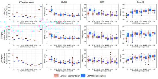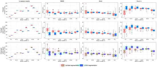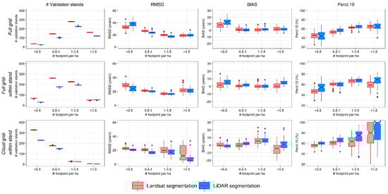 Comparison of the results obtained using the Landsat segmentation (red in Figure 9) and the LiDAR segmentation (blue in Figure 9) shows, with all grids and all sample sizes, that the former had a slightly worse performance as measured by RMSD and Perc.10, and slightly better performance as measured by the BIAS. The difference is relatively small, indicating that despite the oversegmentation discussed in Section 2.4 and Section 4.1, the Landsat segmentation can provide a suitable stand map. At a sample size = 6, the largest difference between the two segmentations was observed in the most conservative ‘cloud grid-within stand’ scenario, where median RMSD, median BIAS, and median Perc.10 were, respectively, 22.01 years, 0.01 years, and 57.77% for the Landsat segmentation, and 19.13 years, 0.42 years, and 63.53% for the LiDAR segmentation (Table 4). Nevertheless, and as expected, the LiDAR segmentation depicts overall higher accuracies compared to the Landsat segmentation when analyzing stratified stand heights (Figure 10), which is accentuated on stands with median ‘rhInfl98’ lower than 10 m.