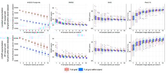Total number of footprints used for training the RF, total number of footprints available for validation, and accuracy (RMSD, BIAS, Perct.10) of the estimated TSD as a function of the training sample size (1 to 10 stands per stratum) and for the six combinations of segmentation-derived stand map and GEDI footprint grid. For each sample size and segmentation/grid combination, the training sample was extracted 100 times: the boxplots summarize the distribution of the accuracy metrics of the resulting 100 TSD estimations. The boxes report the median (thick central line) and the interquartile range of the distribution, the whiskers are 1.5 times the range of the upper and lower quartiles, and the dots show the outliers.